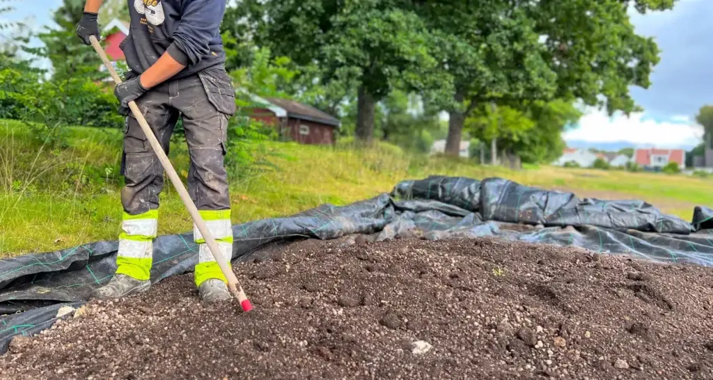 Før du legger ut duken kan du gå over underlaget og utforme det slik du ønsker. Mattene er ikke avhengige av at underlaget er flatt, men det er nå du har muligheten til å terrengformere. Om bakken er hard, kan det være gunstig å bruke en jordfreser for å løse opp underlaget.